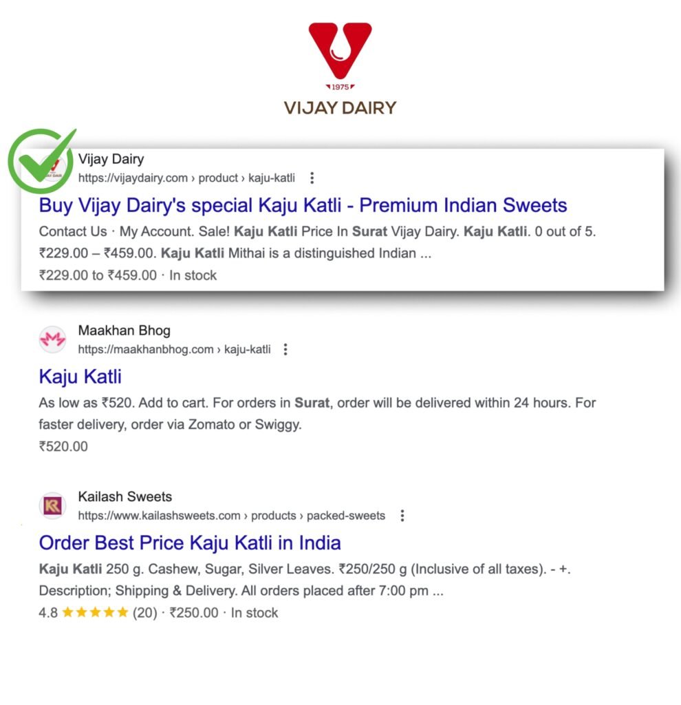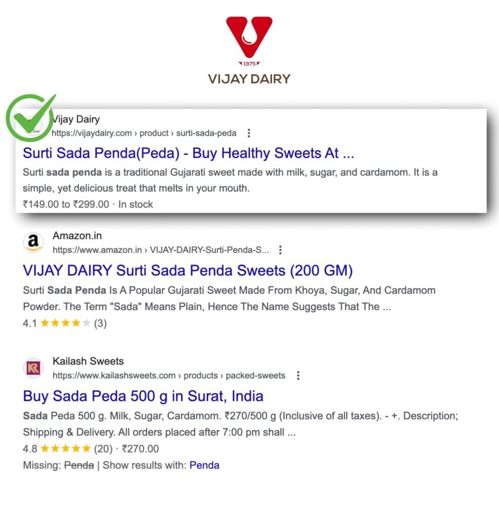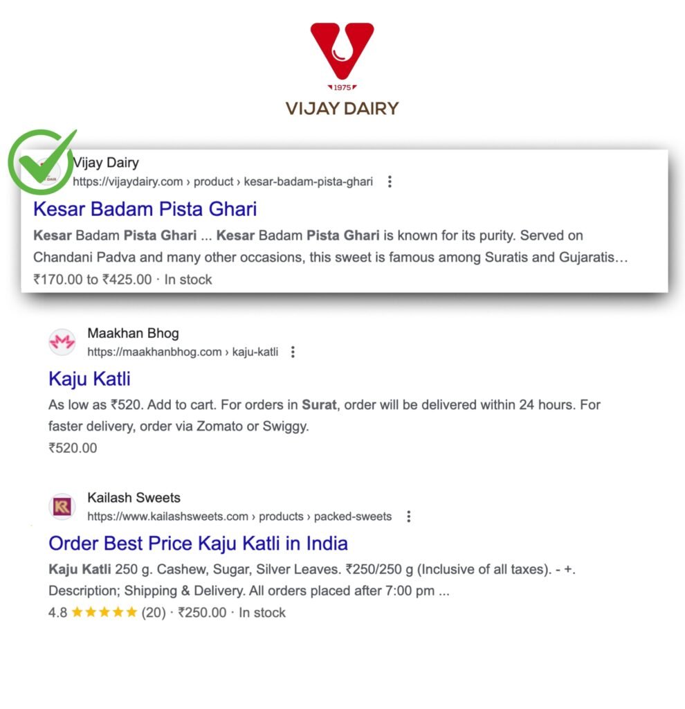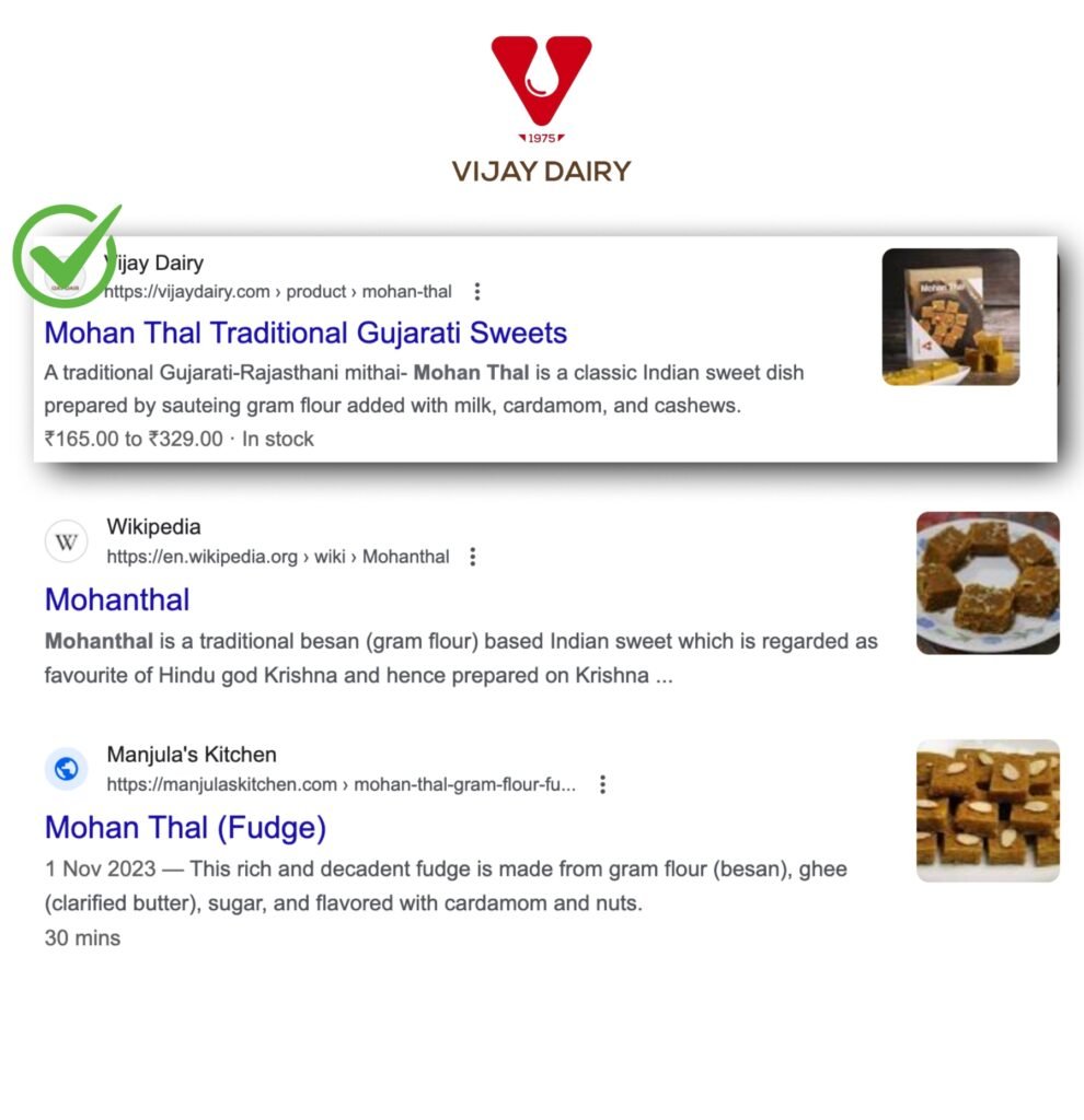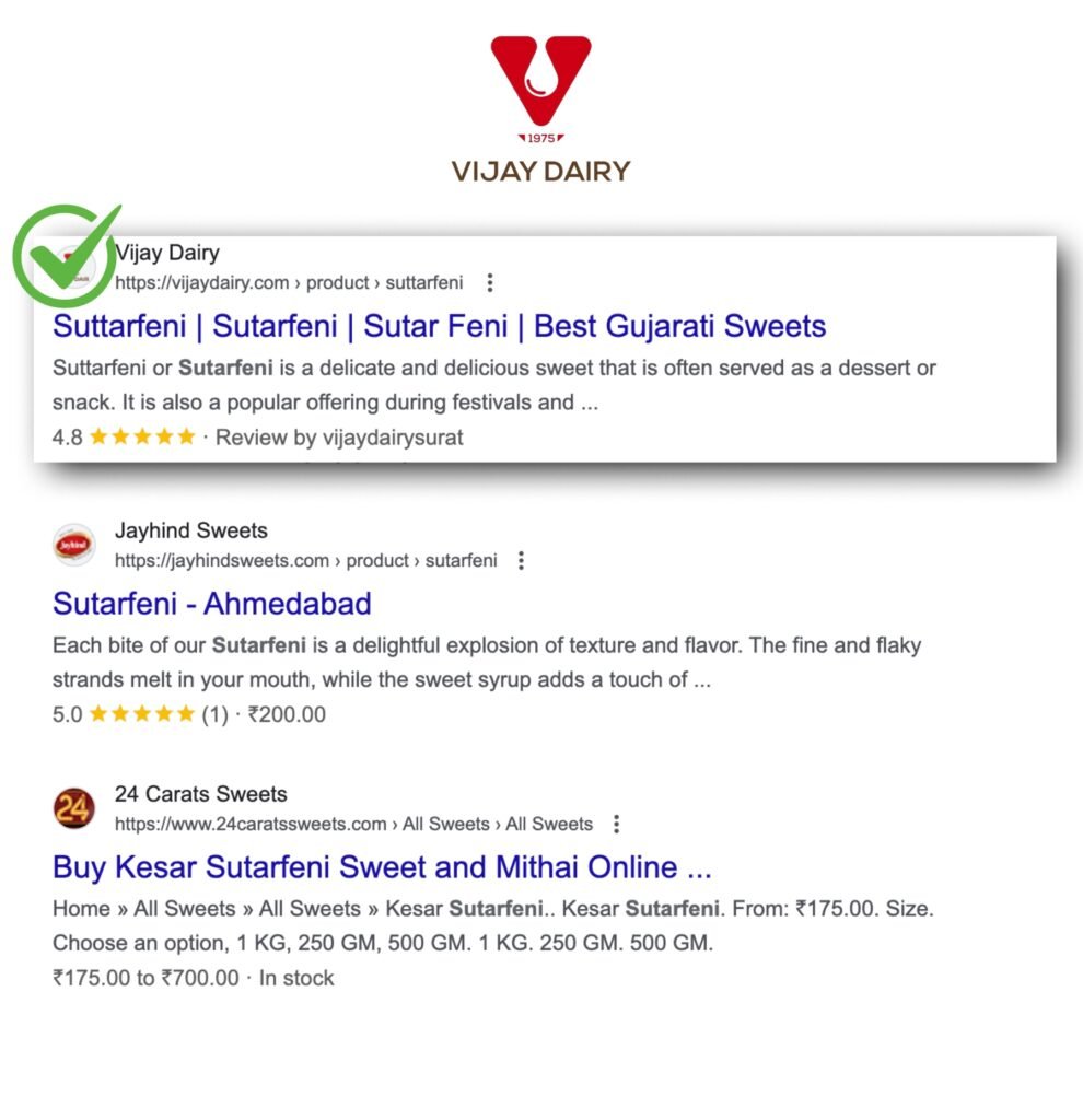 Riofos started working with Vijay Dairy in July 2023 and understood its products, values, goals, and objectives for the website. We created strategies to drive organic website traffic by ranking keywords, optimizing the website, and creating backlinks. We boosted their Domain Authority (DA) to 12 and organic traffic for the website to 16.2K. Following our strategy, Vijay Dairy ranks first or second on 26 keywords like types of ghee, malai ghee, sada penda, Bombay halwa, dry fruit mix sweet, and more.